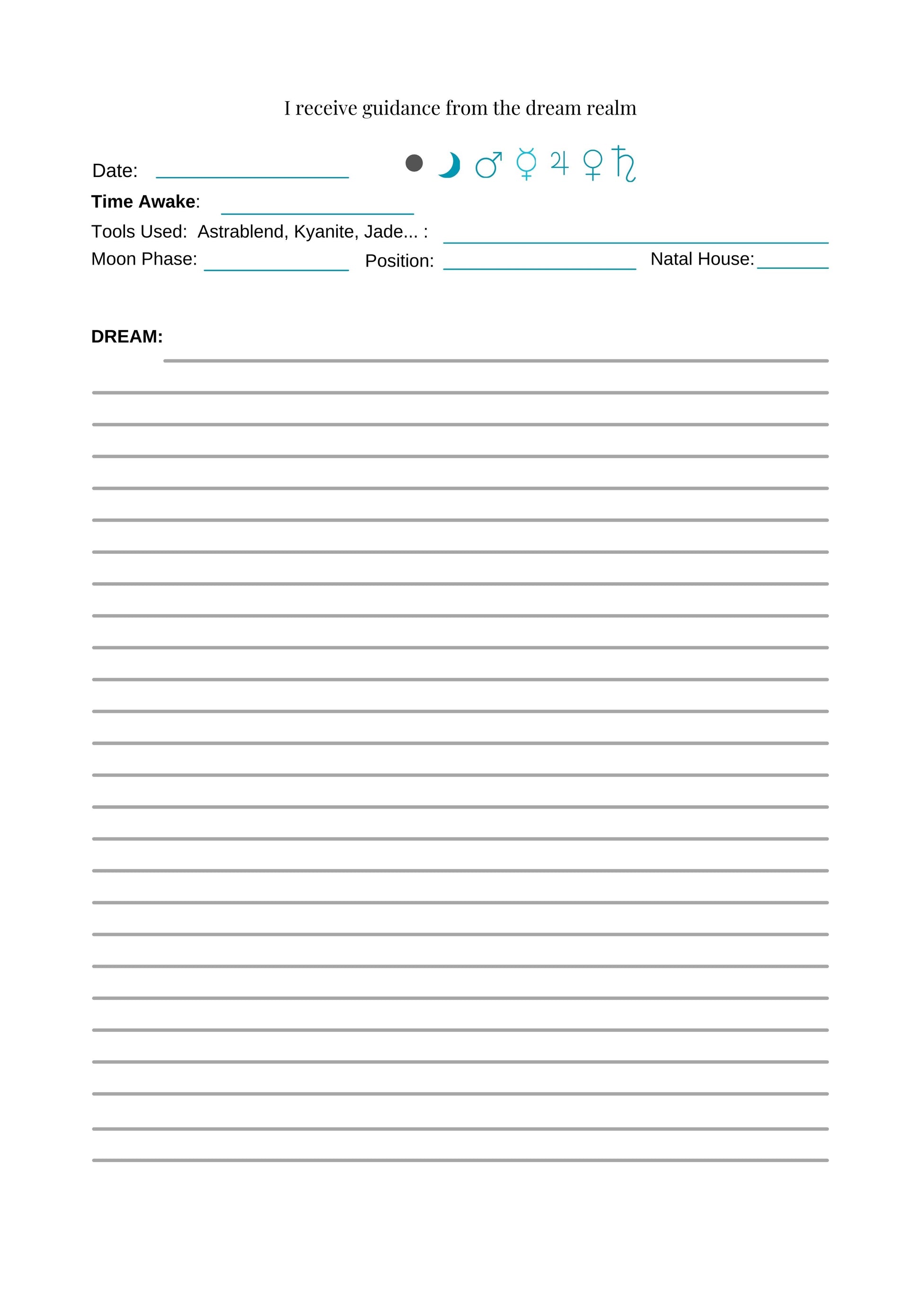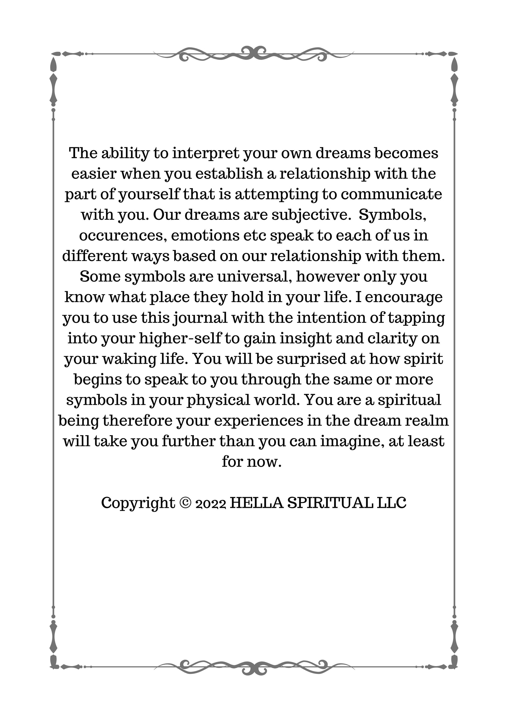 My dream journal is sort of like your own mini akashic record of the astral & material plane and allows you as the dreamer to document your journey within these planes. All of this information makes it easier to assist you with analyzing your dreams and distinguishing each experience as either an exploration of the astral/dream realm, or unprocessed emotions, prophetic dreams, insight, creative inspiration, even those working against you etc. You'll find daily affirmations and references to astrology and cartomancy within the pages of this journal. This is one of the best gifts for dreamers or anyone who loves to journal. It will last you about 2 months work of dreams if you are consistent with daily journaling; otherwise longer if you don't dream every single day.